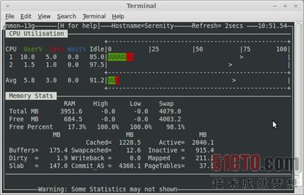 nmon是Nigel’s Monitor的簡(jiǎn)稱,這款廣受歡迎的開(kāi)源工具用來(lái)監(jiān)控Linux系統(tǒng)的性能。nmon可以監(jiān)控多個(gè)子系統(tǒng)的性能信息,比如處理器使用率、內(nèi)存使用率、運(yùn)行隊(duì)列的信息、磁盤(pán)輸入/輸出統(tǒng)計(jì)信息、網(wǎng)絡(luò)輸入/輸出統(tǒng)計(jì)信息、內(nèi)存分頁(yè)活動(dòng)和進(jìn)程衡量指標(biāo)。然后,你可以通過(guò)curses“圖形化”界面,查看nmon的實(shí)時(shí)系統(tǒng)衡量結(jié)果。