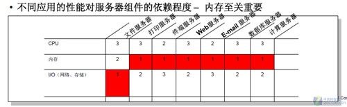 導讀:當很多人在拼命追求CPU的速度,以期讓服務器獲得更高的性能的時候,一項測試卻表明,不同應用的性能對服務器的三大組件——CPU、內存和I/O的依賴程度,內存居然排在了******位。