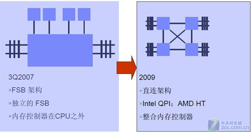 2009年,英特爾在Nehalem處理器中開始集成內存控制器,這就是QPI架構。通過QPI總線,處理器之間可以直接相連,不再需要經過擁擠、低帶寬的FSB共享總線,多處理器系統運行效率大為提升。