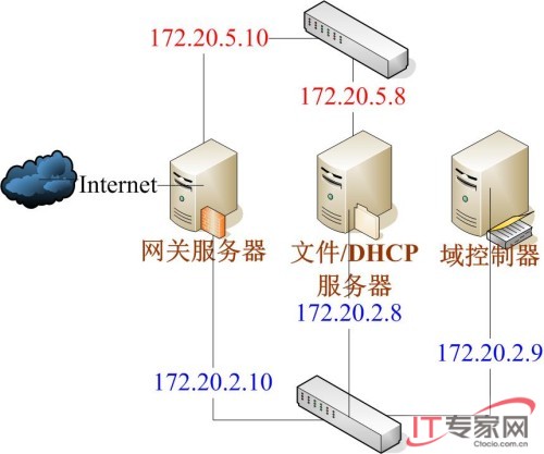 有1臺域控制器,一臺文件服務器,一臺網關服務器(安裝路由和遠程訪問服務的計算機);其中文件服務器、網關服務器使用雙網卡,為兩個網段提供服務,文件服務器2塊網卡IP:網卡01-172.20.2.8,網卡02-172.20.5.8;網關服務器IP,網卡03-172.20.2.10,網卡04-172.20.5.10。