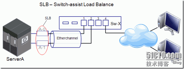 SLB是Switch-assist Load Balance,顧名思義,交換機協助的負載均衡,就是需要在交換機上進行相應的配置以后才能實現。SLB Team中的2個網卡必須連接到同一個交換機,這2個網卡到同一交換機的2個端口之間的鏈路就合并組成一個通道,這個通道Cisco交換機術語叫 Etherchannel,其他廠商的交換機則常稱這個為Port Trunk。這種組成聯合通道的方式也稱之為靜態的鏈路聚合(SLA, Static Link Aggregation)。SLB方式的Teamport是雙向2Gb,Tx和Rx的數據流都可以做到負載均衡,但是它只能保證網卡的容錯,做不到交換機的容錯。