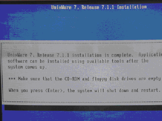 至此,我們已經安裝完了UnixWare 7.11 的******張光盤。這時系統會提示重啟" system coming to up",然后重啟系統。